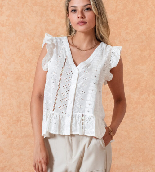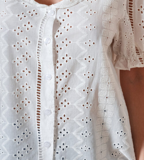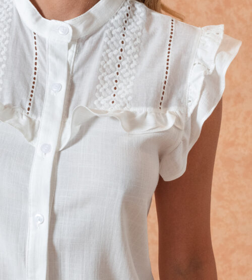 Camisa de voile de algodón 100%, cuello y puño combinado de broderie.Detalle de pinza ancha de broderie
