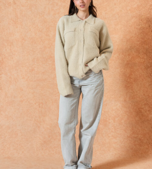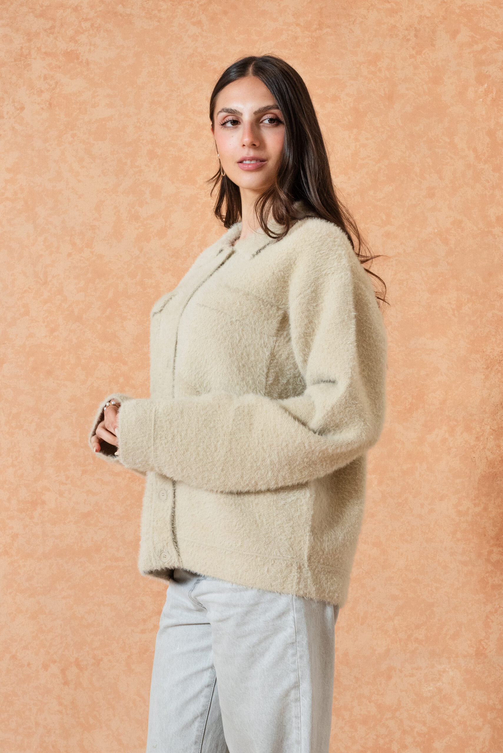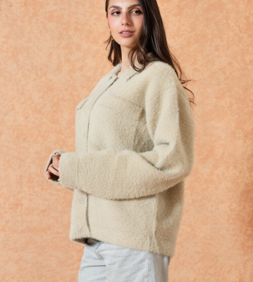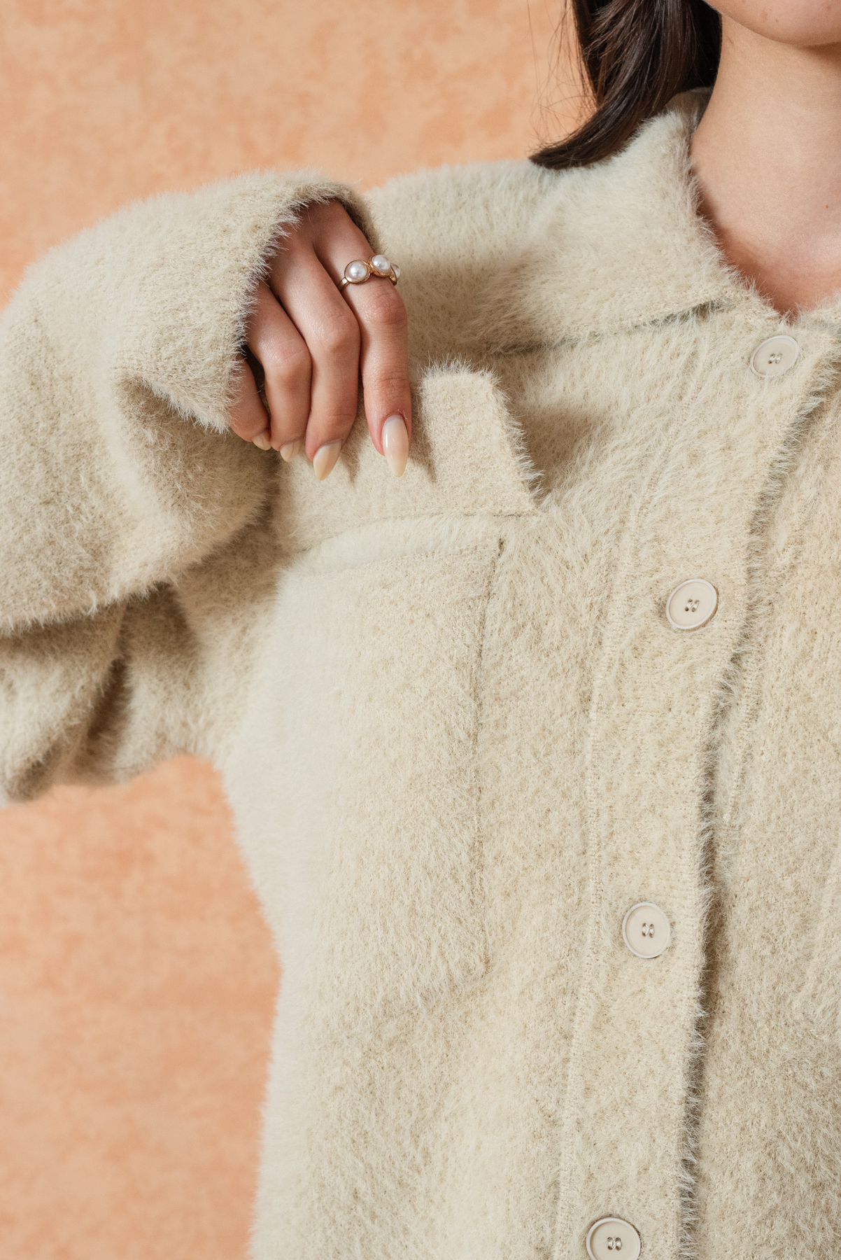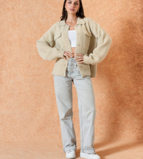 Saco tipo de paño abrigado, Modelo holgado y largo con botones.