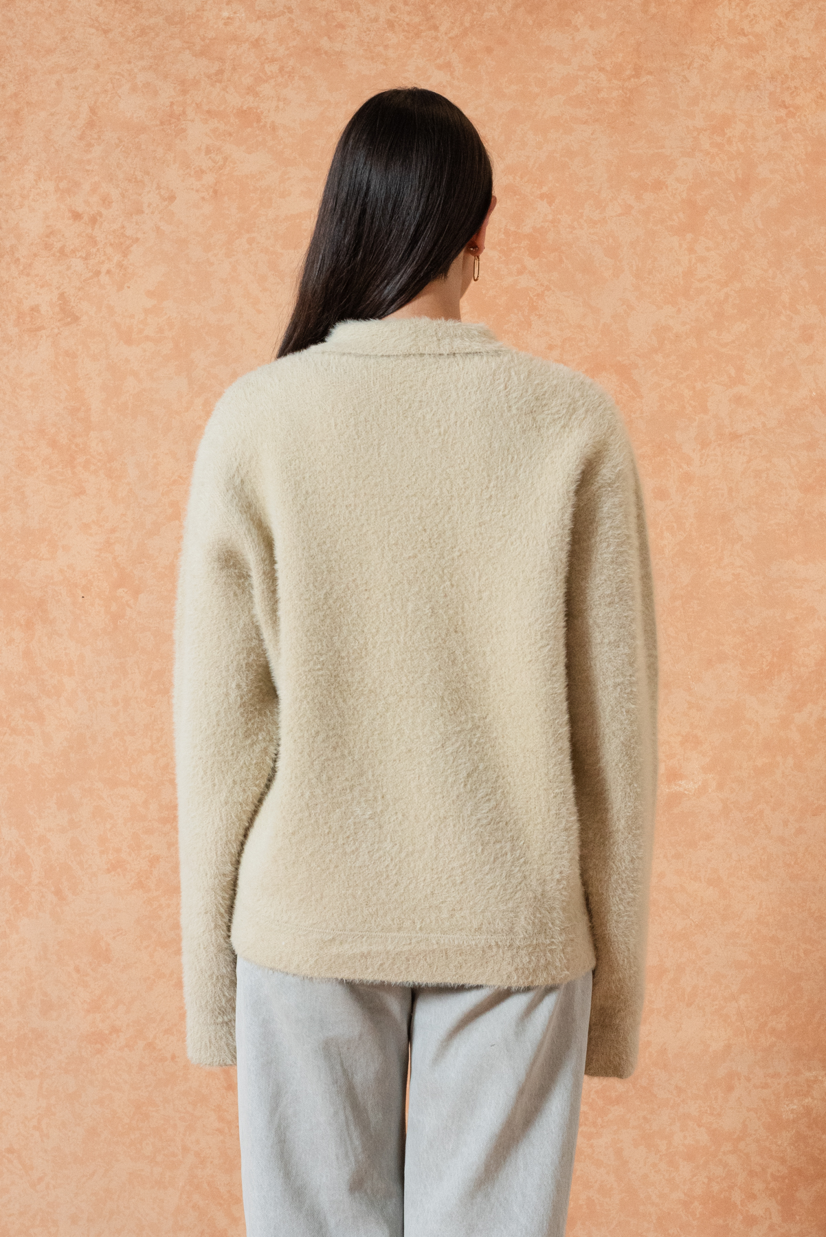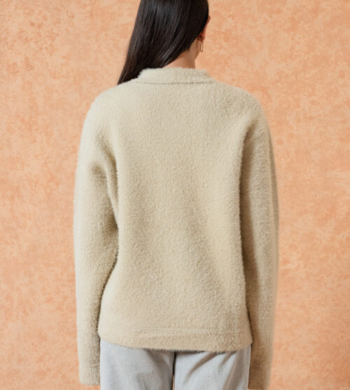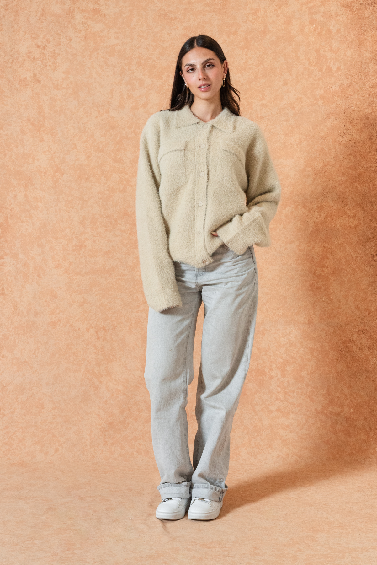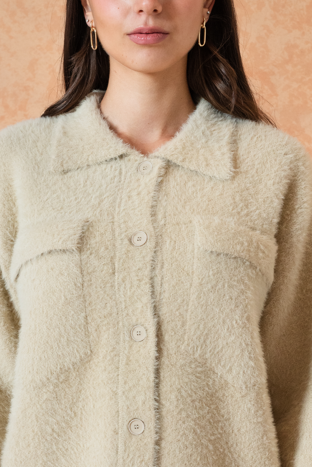 Saco tipo de paño abrigado, Modelo holgado y largo con botones.