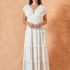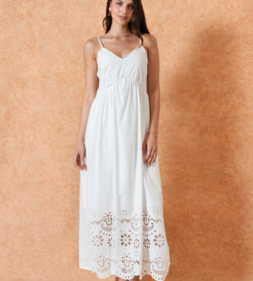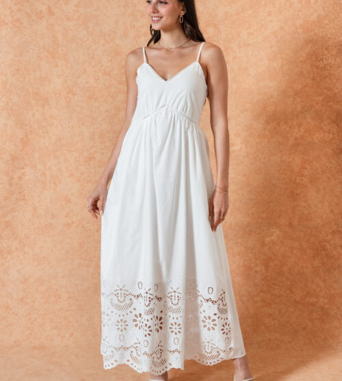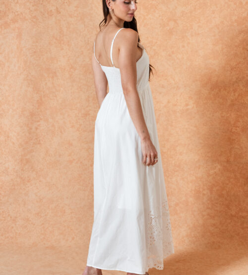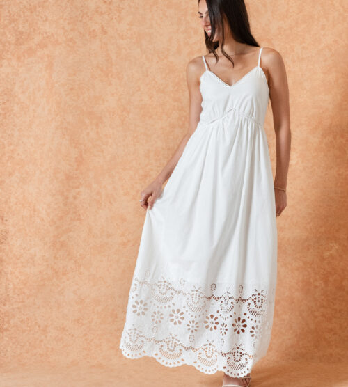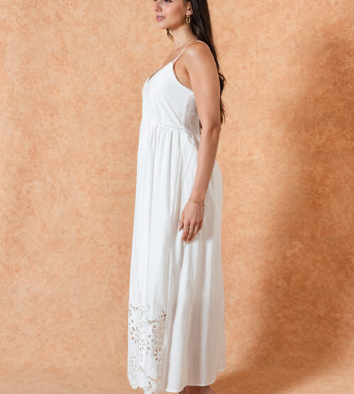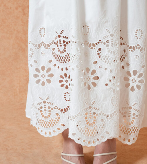 Modelo Largo con elástico en la espalda baja, detalles de broderie en la parte baja delantera y detalles de puntillas